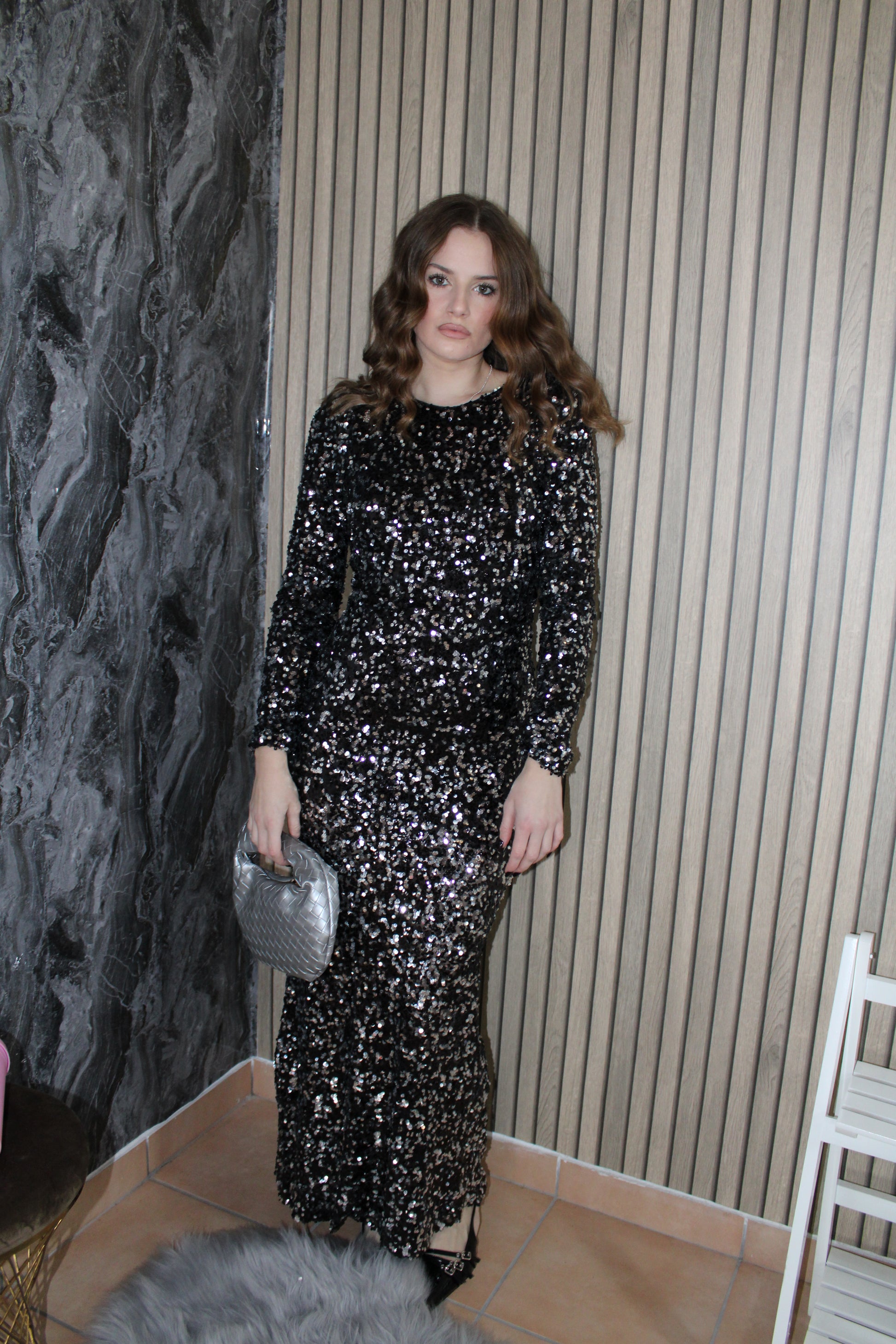 Abito lungo ricoperto di paillettes con spalline gonfie al suo interno e schiena scoperta .