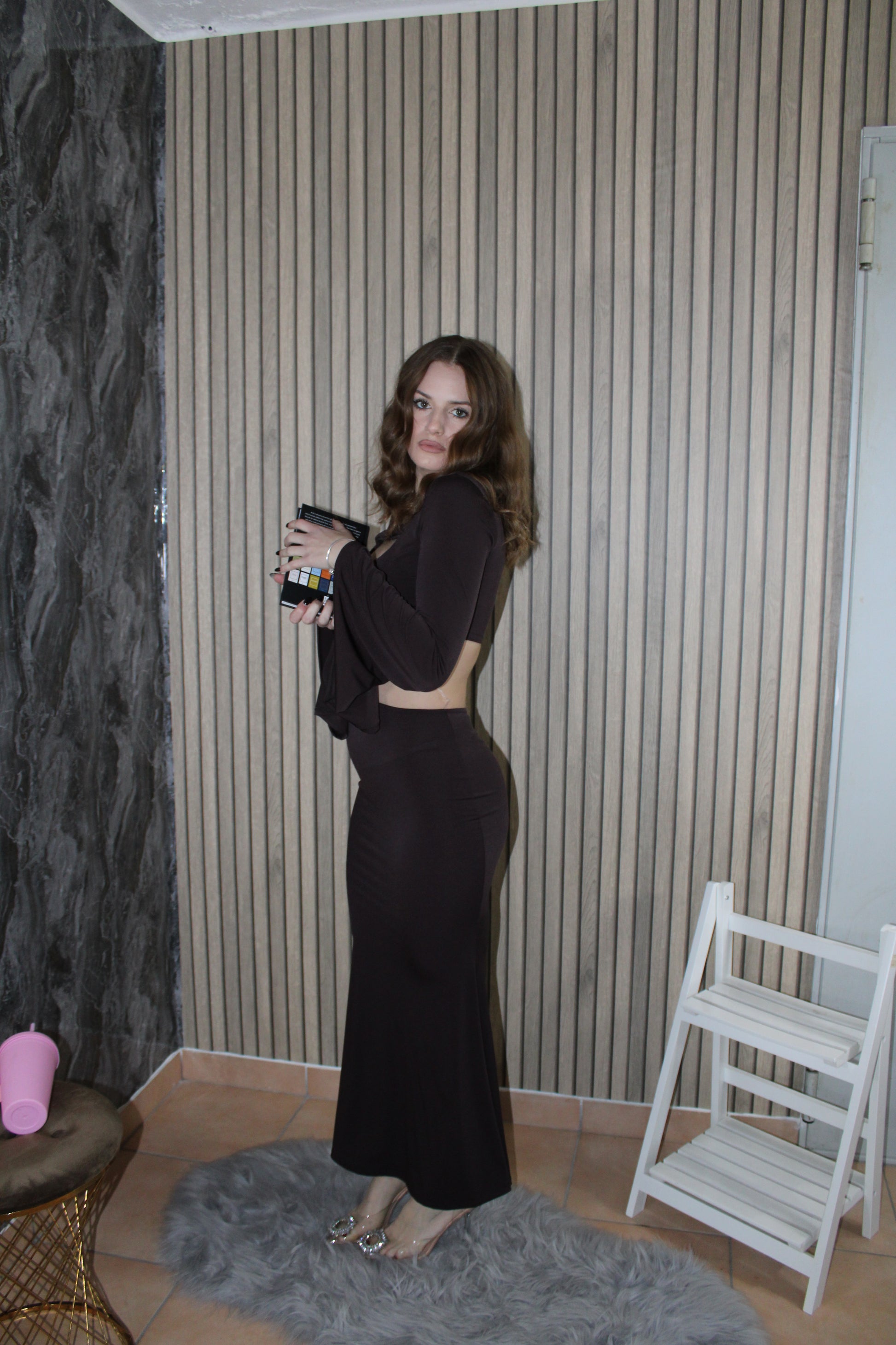 Abito maxi lungo, con dettagli nella parte superiore.