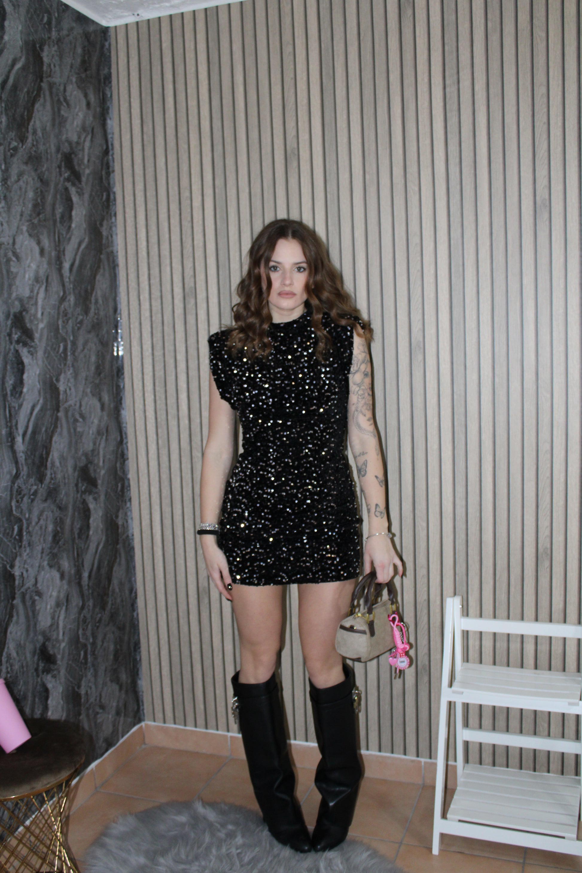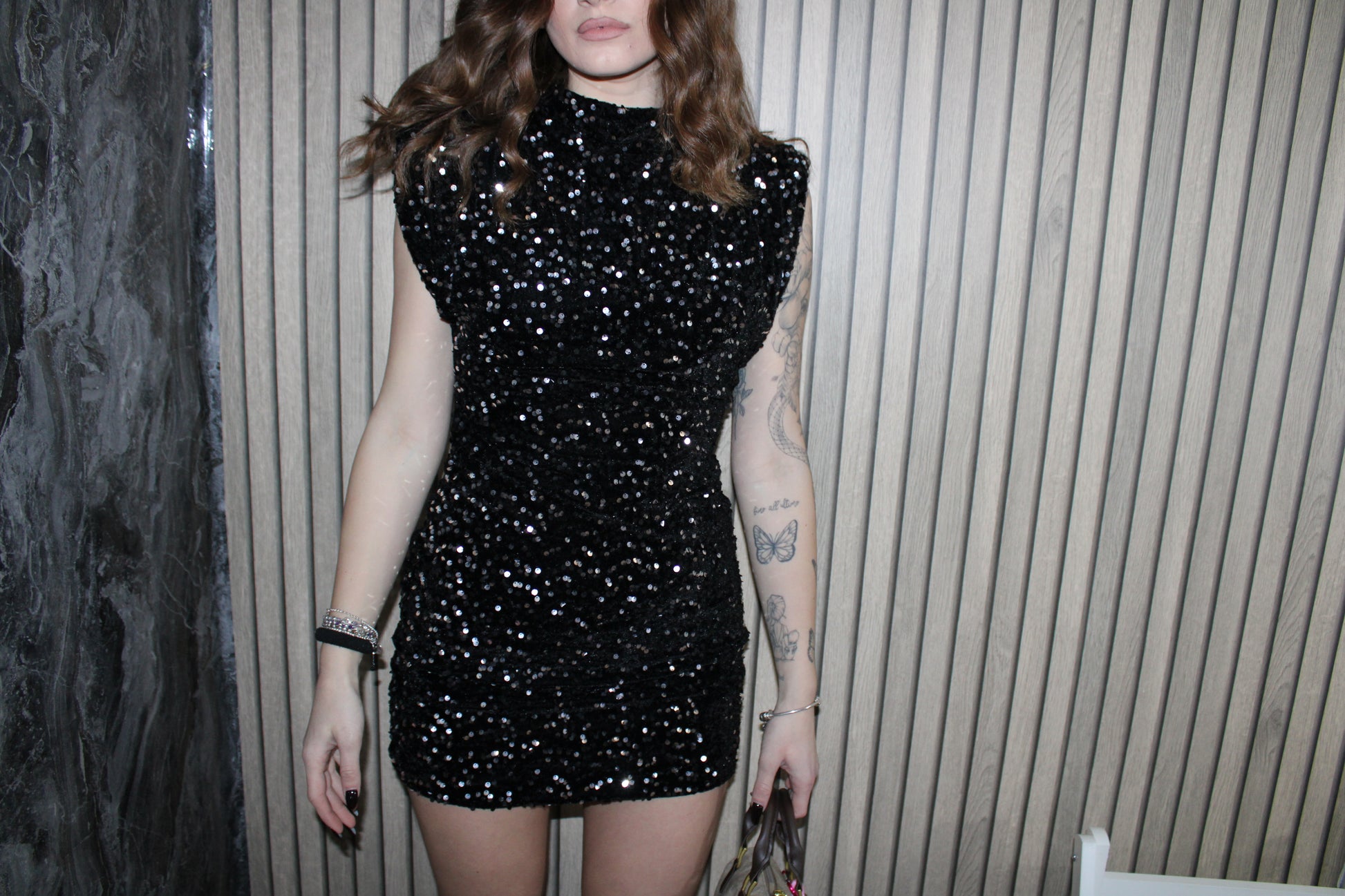 Mini abito in ciniglia , ricoperto di paillettes argentate.