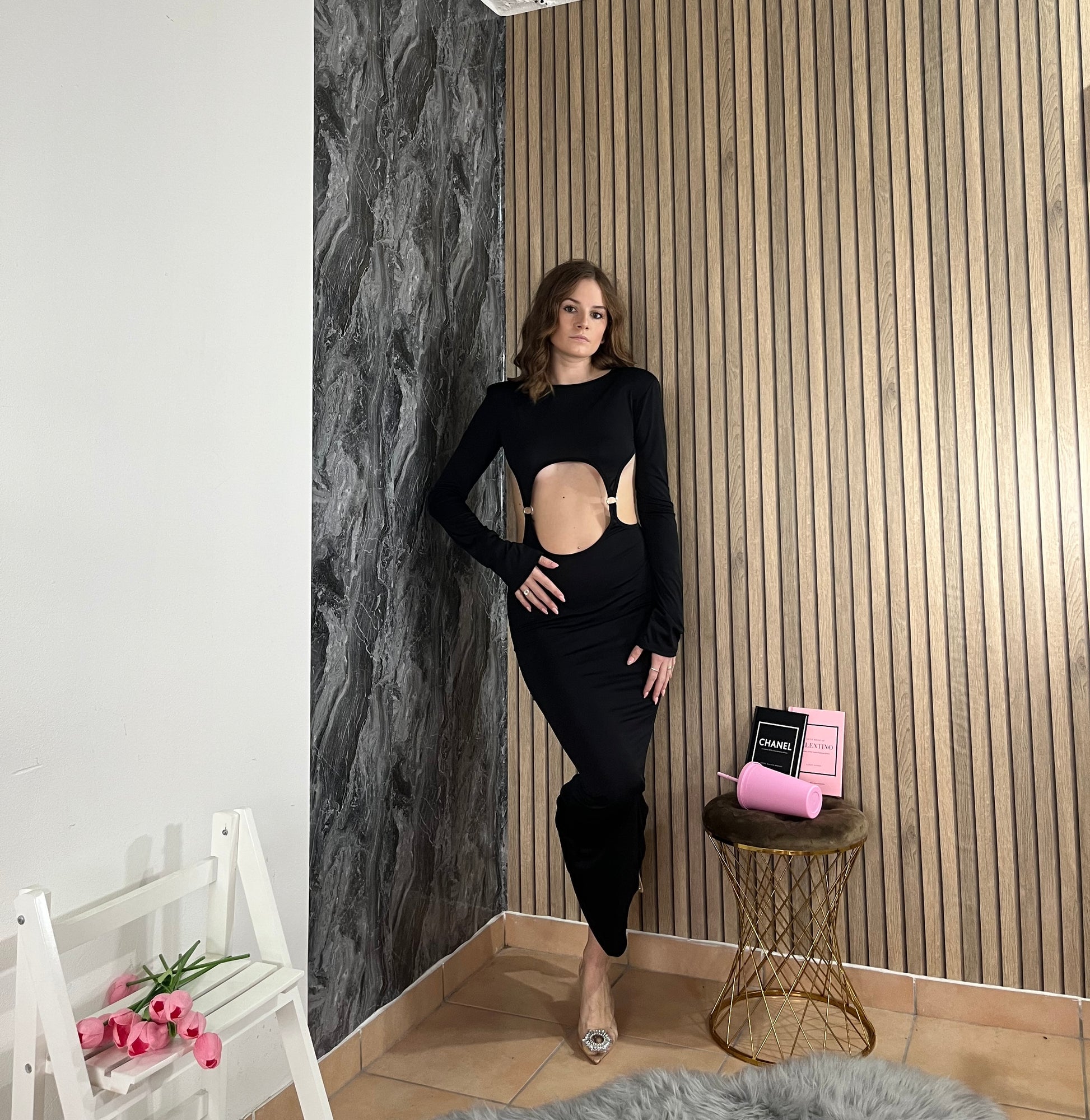 Abito lungo con Details anelle, schiena scoperta e maniche a campana.