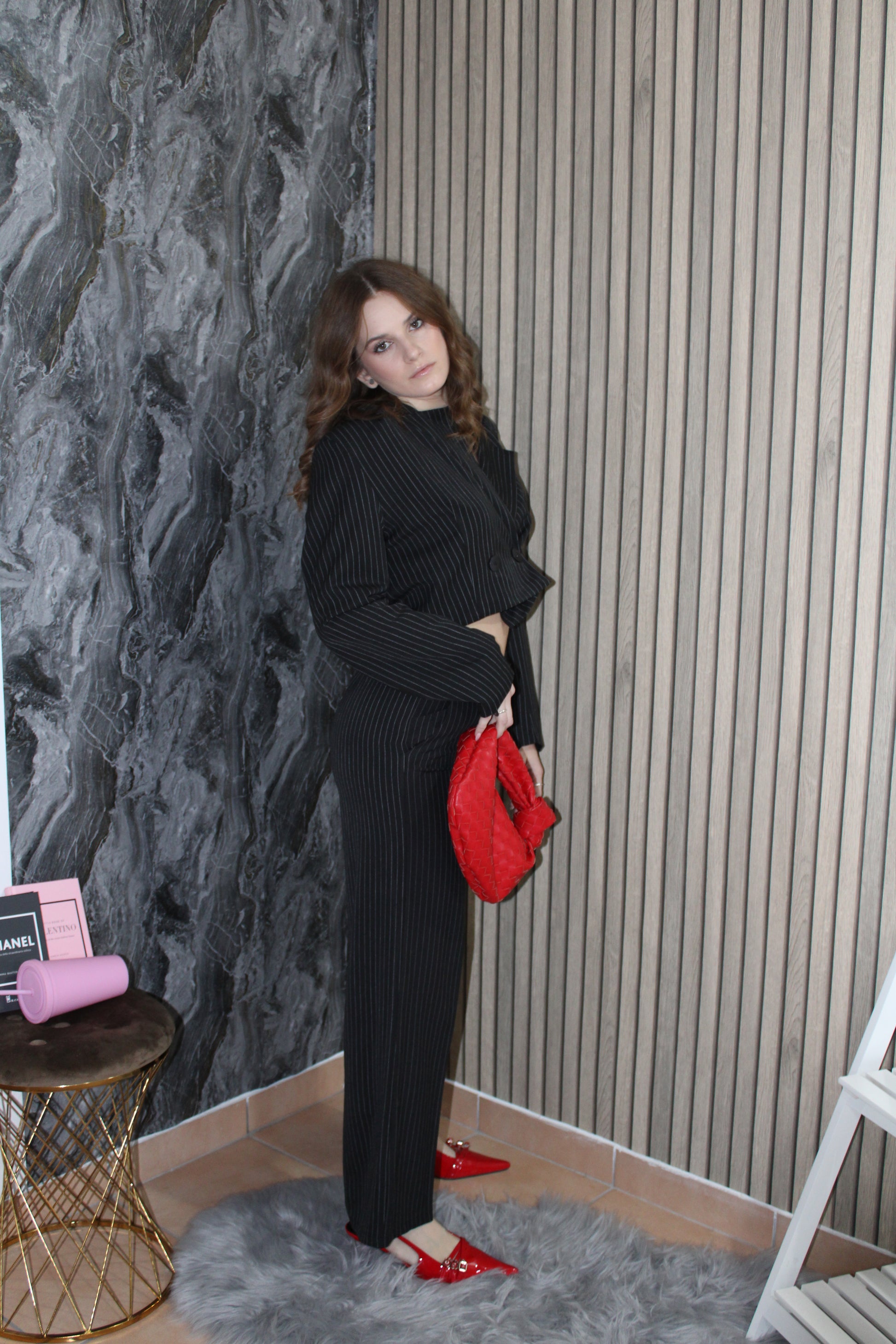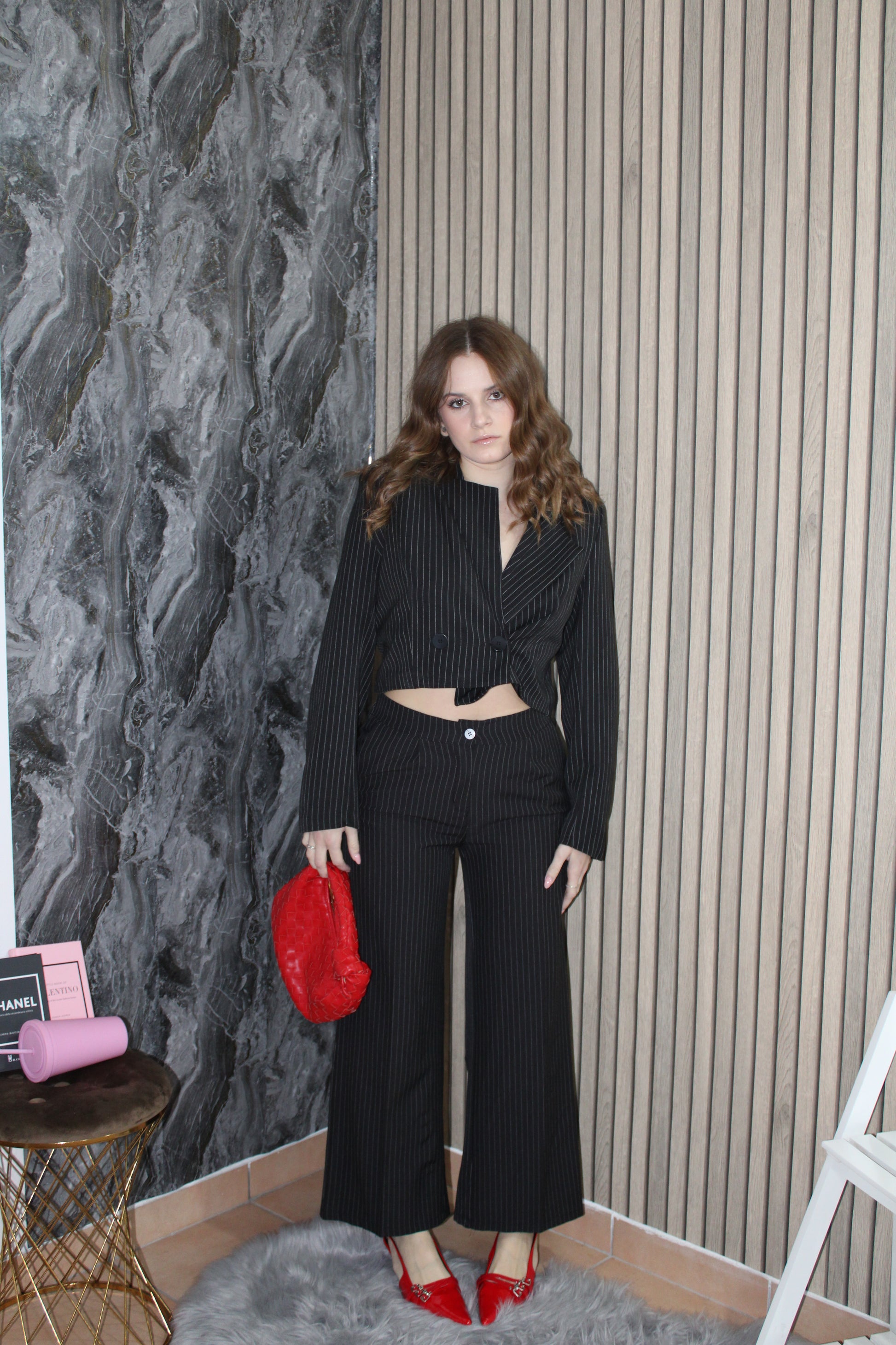 Tailleur composto da giacca a righe con cappuccio e pantalone con elastico in vita