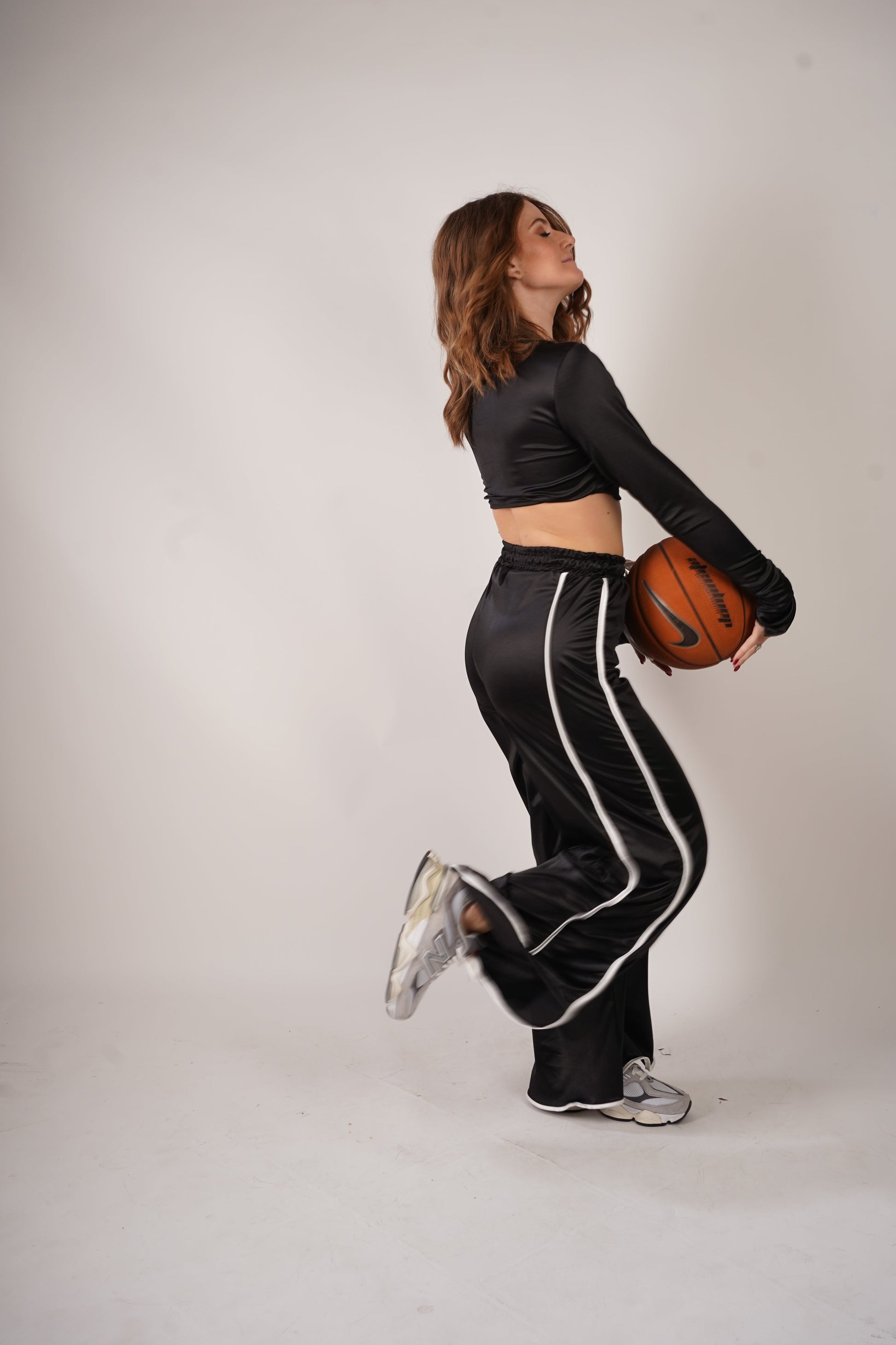 Tuta elastica, taglia 36/44, con felpa crop e pantalone largo